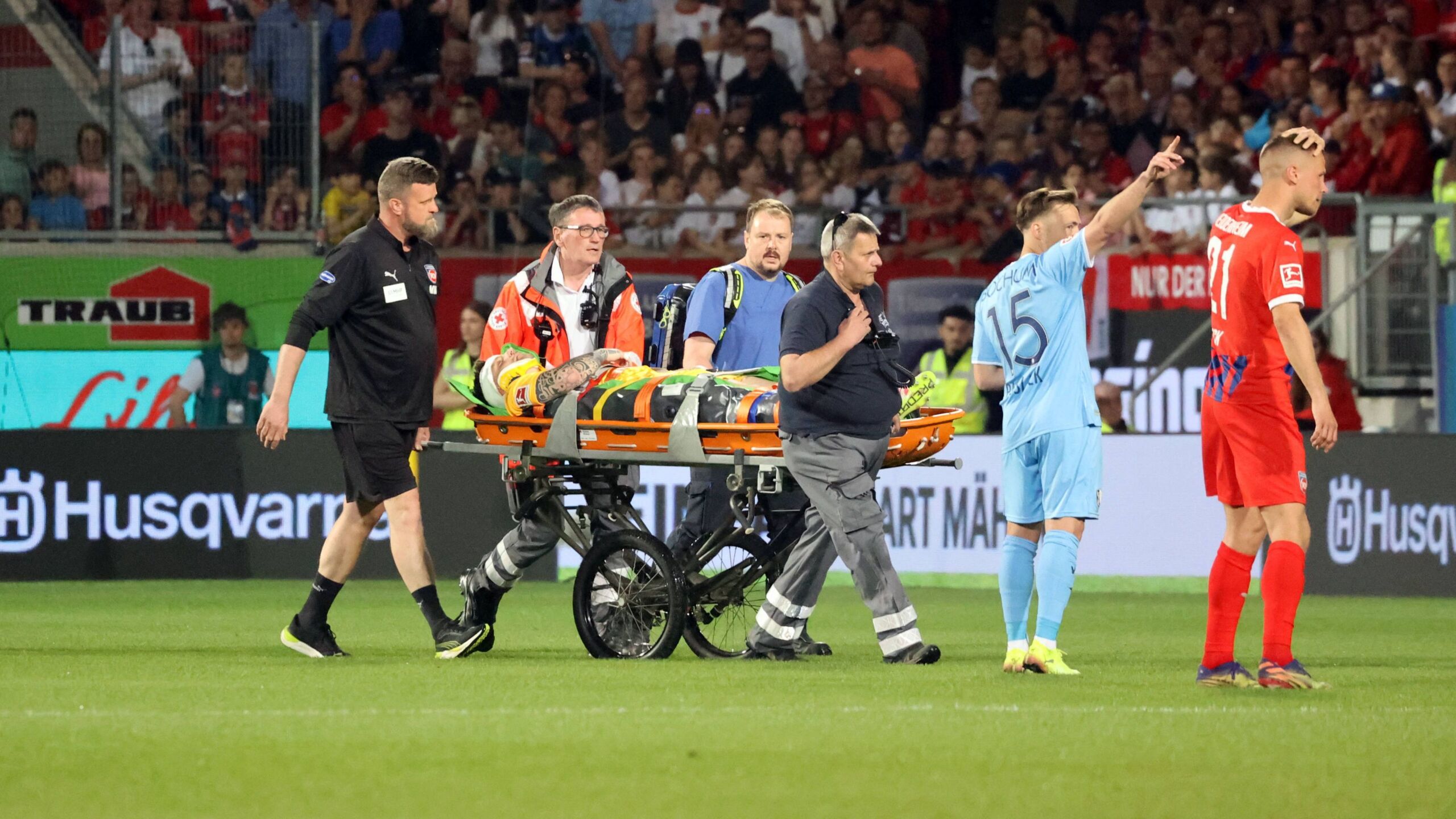 Tim Siersleben versuchte direkt erste Hilfe zu leisten, ehe die aufs Feld geeilten Sanitäter und Ärzte rasch übernahmen. In der zuvor noch stimmungsvollen Voith-Arena wurde es mucksmäuschenstill. Nahezu alle Zuschauer blicken gebannt in den Heidenheimer Strafraum, wo Müller behandelt wurde. Die Szene hielt länger an, ergo wurde eine Plane ausgebreitet, die den Spieler vor allzu neugieren Blicken schützen.