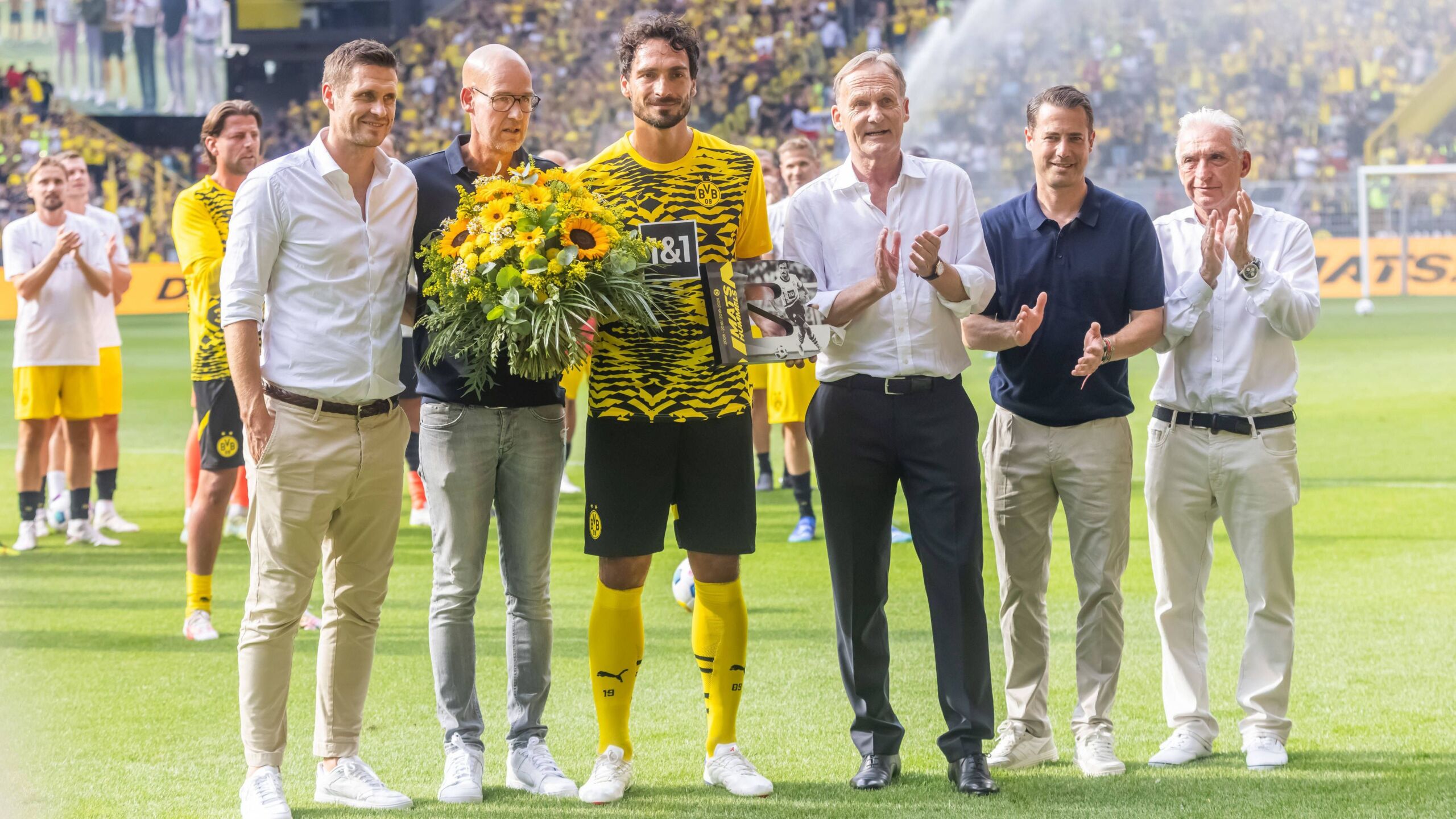 Bislang hatte sich noch keine Gelegenheit geboten, Hummels in Dortmund auf großer Bühne zu verabschieden. Anders als die andere Vereinslegende Marco Reus, dessen Abschied vom BVB im Sommer 2024 bereits vor Saisonende verkündet worden war, hatte sich die Zukunft von Hummels damals erst nach dem verlorenen Champions-League-Finale gegen Real Madrid entschieden.