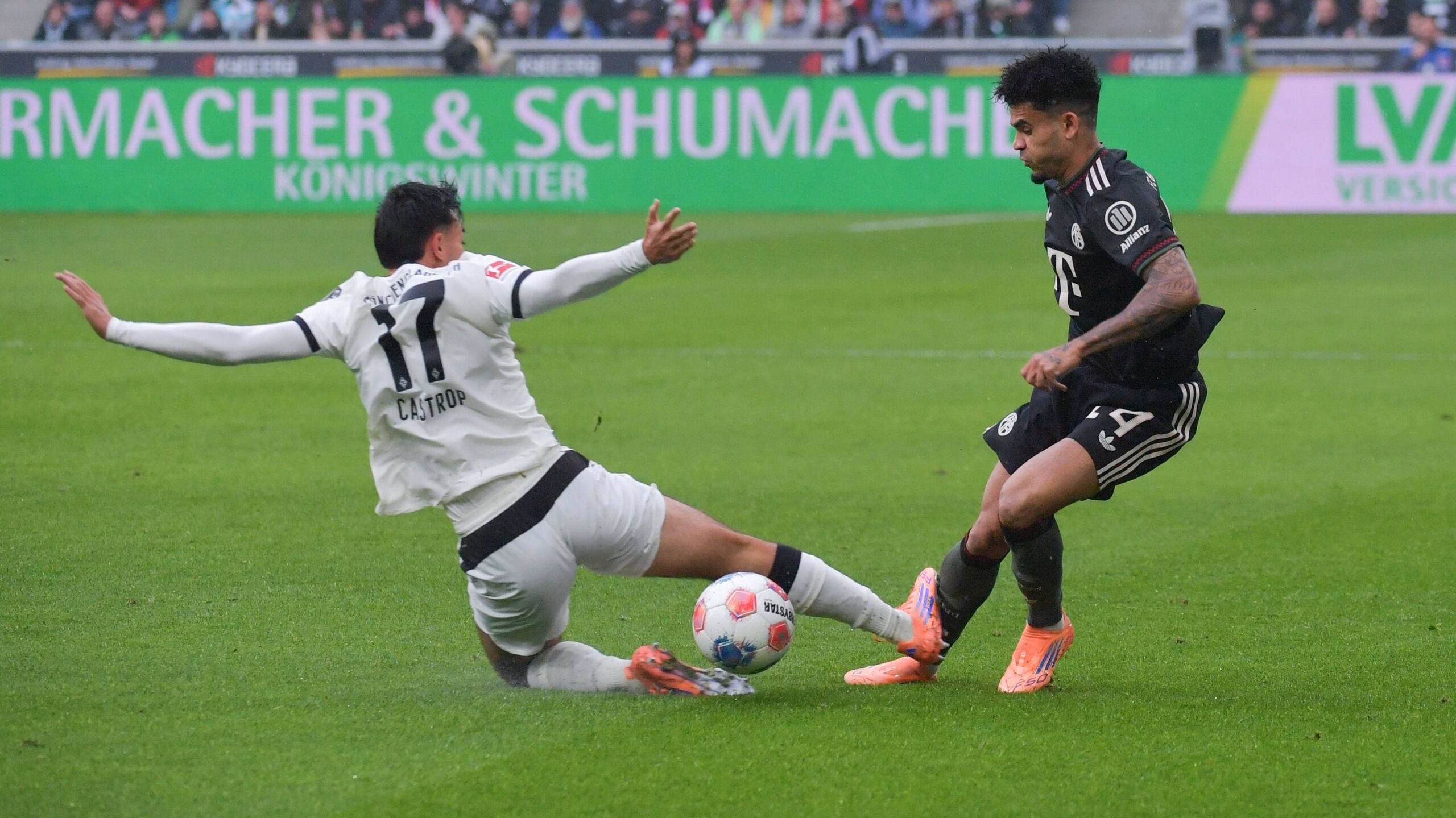 Im linken Halbraum war Minuten zuvor Jens Castrop gegen Luis Diaz deutlich zu spät gekommen und hatte den Münchner Offensivmann am Schienbein getroffen, als dieser den Ball längst am Gladbacher vorbeigelegt hatte. Zunächst hatte Schiedsrichter Sascha Stegemann die Gelbe Karte gezückt, wurde nach Hinweis des Videoschiedsrichters aber zur Kontrolle an den Bildschirm gebeten. Was Castrop da bereits ahnte, erhärtete sich wenig später. „Nach Ansicht der Bilder liegt ein gesundheitsgefährdendes Foulspiel vor“, sagte Stegemann über das Stadion-Mikrofon durch, revidierte die vorherige Entscheidung und verwies Castrop des Feldes.