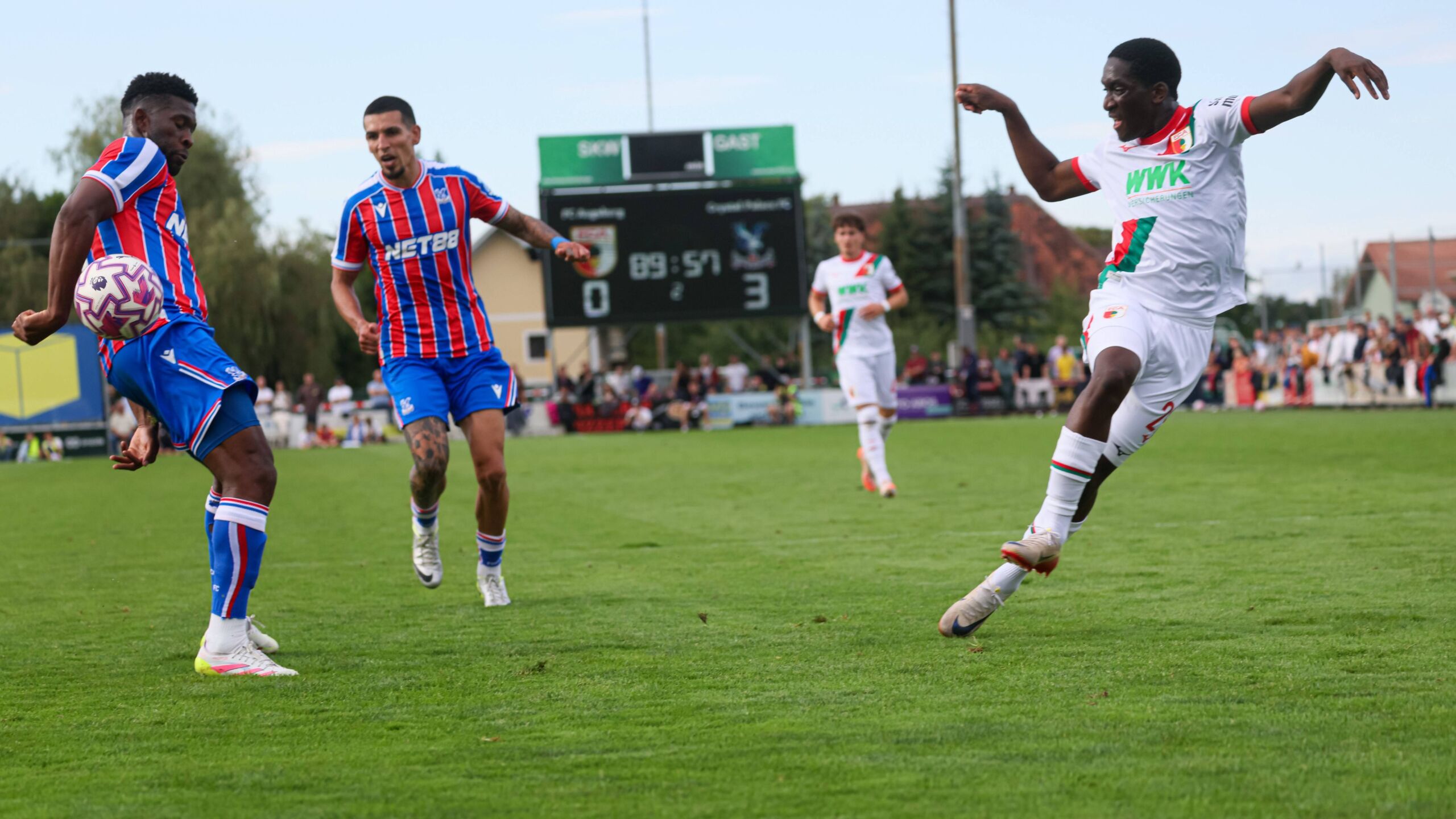 Knapp eine Woche vor dem englischen Supercup gegen Meister Liverpool (10. August, 16 Uhr) setzte Palace-Trainer Oliver Glasner im ersten Duell auf die gleiche Startelf wie im siegreichen Pokalfinale gegen Machester City (1:0), mit dabei waren Richards (früher FC Bayern), Lacroix (Wolfsburg), Kamada (Frankfurt) und Mateta (Mainz). Der FCA hielt ebenfalls mit einer möglichen Startelf für den Pflichtspielauftakt dagegen, erstmals begann Neuzugang Massengo neben Jakic im zentralen Mittelfeld in einem 3-4-2-1-Sysstem.