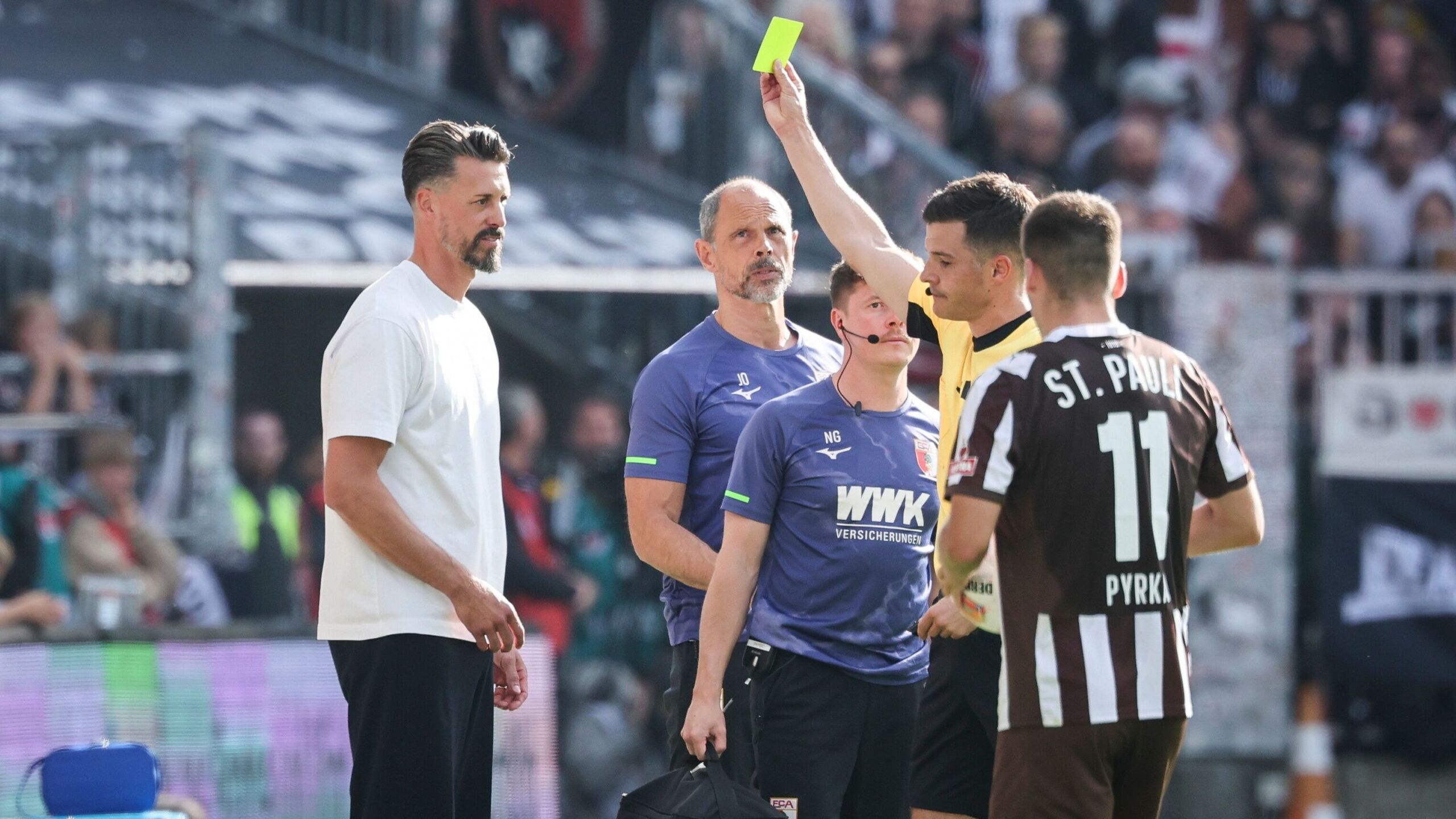 Dabei hatte sich der 37-Jährige vor der Saison explizit vorgenommen, ohne Verwarnung durch die 34 Spieltage zu kommen. Dieses Vorhaben darf als grandios gescheitert betrachtet werden, seit dem 1. Spieltag übrigens schon, als Augsburgs Trainer beim 3:1-Sieg in Freiburg erstmals verwarnt wurde. Die zweite Gelbe Karte holte er sich am 3. Spieltag beim 1:2 auf St. Pauli, nach drei Spielen Pause nun die dritte.